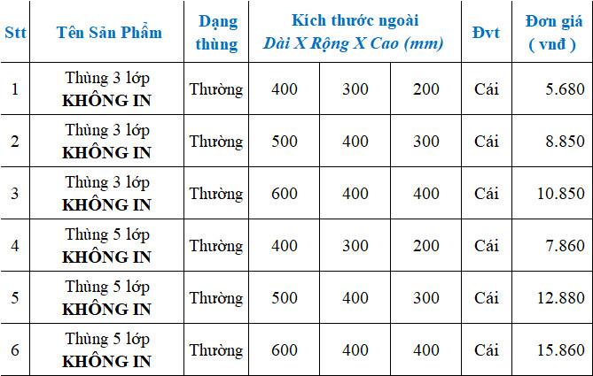 Dưới đây là báo giá thùng carton giá rẻ tại Bình Dương, áp dụng cho các kích thước và số lớp phổ biến: