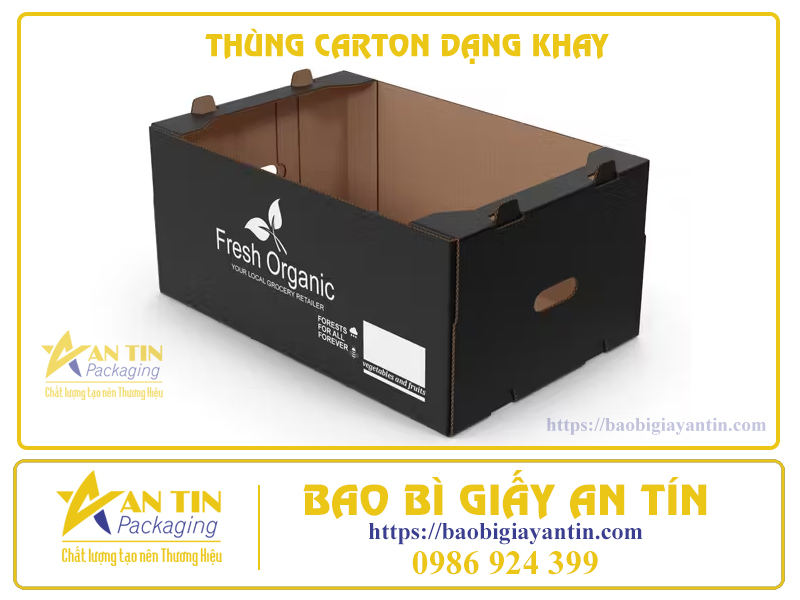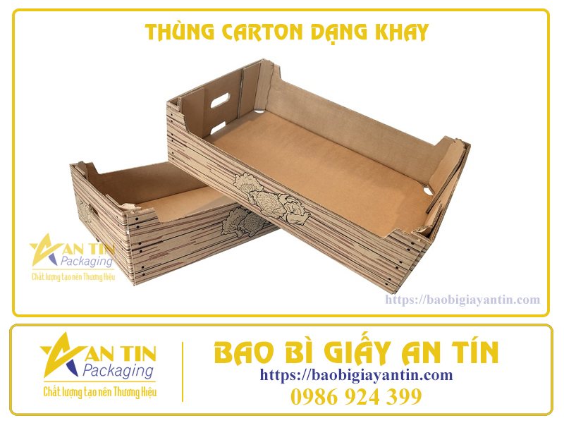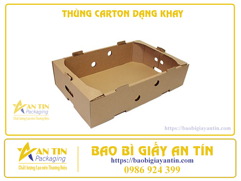 Thùng carton dạng khay thường được sử dụng để đóng gói trái cây và rau quả trong quá trình vận chuyển và lưu trữ, giúp bảo vệ sản phẩm và giảm thiểu tỷ lệ hư hỏng.