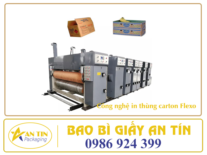 In Flexo là công nghệ in trực tiếp lên bề mặt của thùng carton từ bản in nổi Polymer. Với bề mặt in lớn nên Flexo thường được áp dụng để in các loại thùng carton có kích thước to như thùng carton đóng gói nông sản, thiết bị điện gia dụng, thùng carton chuyển nhà,....