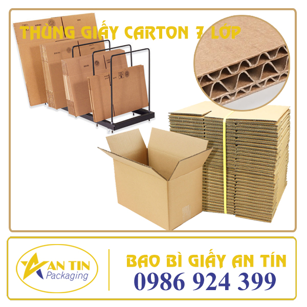 Thùng carton 7 lớp: là thùng giấy carton được cấu tạo bởi 2 lớp phẳng ngoài( giấy nâu, giấy trắng, …) và 5 lớp sóng ở phía trong gồm 3 lớp sóng hình Sin và 2 lớp phẳng xen giữa 3 lớp sóng ( giấy xeo,…)